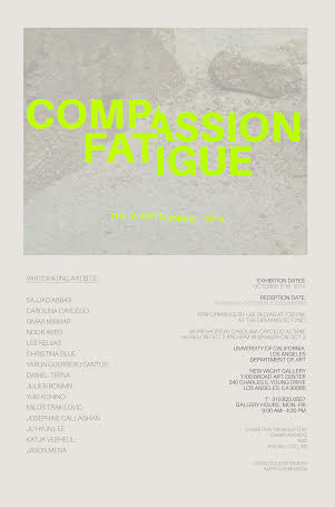 The UCLA New Wight Biennial, Compassion Fatigue, will present work from 15 international emerging artists using installation, performance, video, photography and sound to enable intimate ways of viewing political crisis.