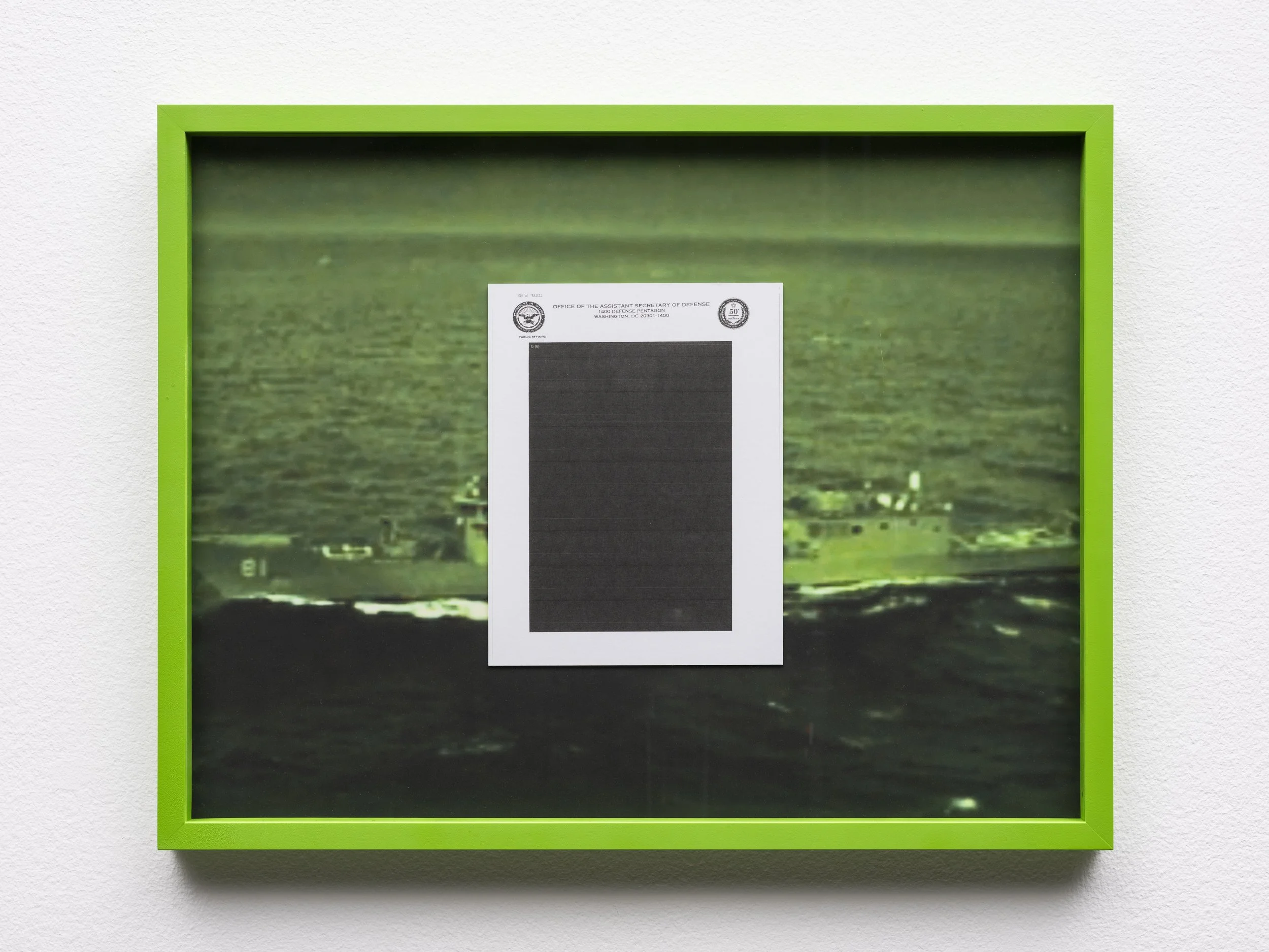 Nightvision is a series of five works that utilize green screen, black outs, and night vision to reflect upon technologies of seeing beyond what the eye can perceive. This series of works on paper overlay night vision scenes from mainstream films and television episodes with heavily redacted documents from the entertainment industries’ coordination with defense agencies. Text range from 1960s documents of CIA conversations with James Bond films, to 2012 conversations between the CIA and Zero Dark Thirty directors and writers. At REDCAT the lights in the exhibition were programmed to shut off when there were blackouts in the film, so these framed works had moments of being darkness within the exhibition run.